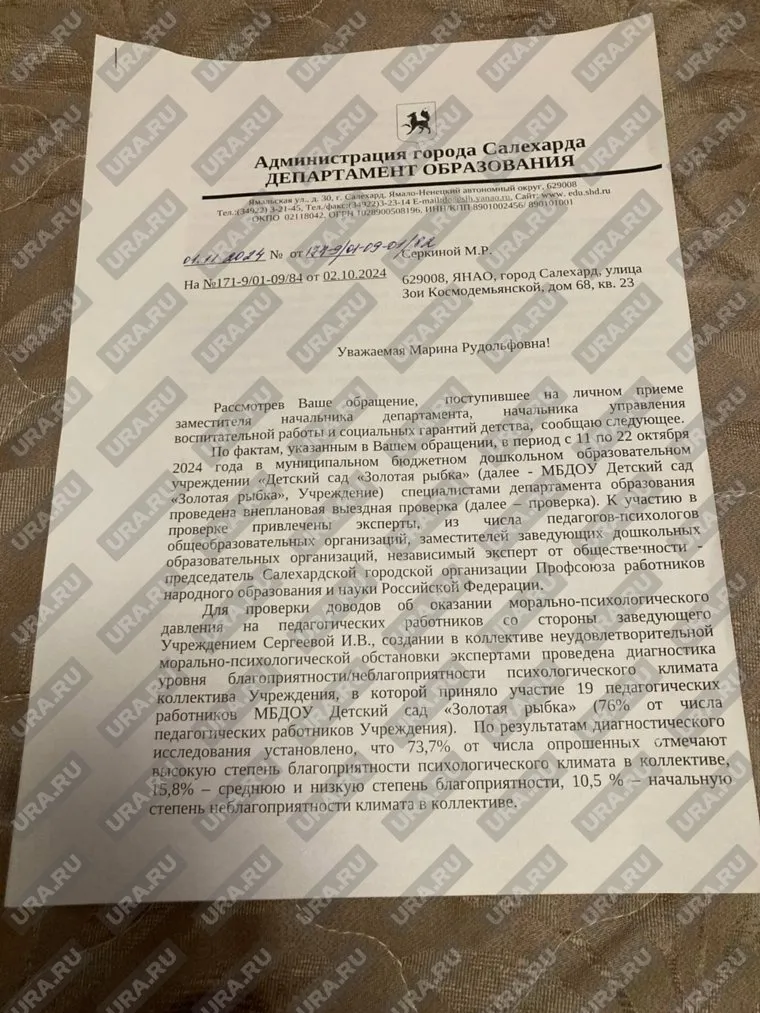Ранее URA.RU сообщало, что официальных жалоб от родителей на работу детского сада «Золотая рыбка» не поступало. Однако за период с 2023 года по 2024 год зарегистрировано три обращения педагогов в прокуратуру Салехарда и одно в депобразования.