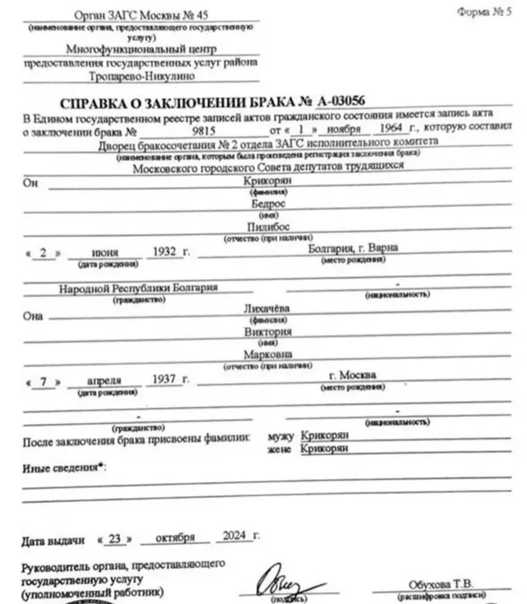Народный артист РФ Филипп Киркоров раскрыл, что его настоящая фамилия — Крикорян, а не Киркоров. В своих соцсетях он опубликовал свидетельство о заключении брака своих родителей, поздравив их с годовщиной. Многие подписчики удивились настоящей фамилии певца.