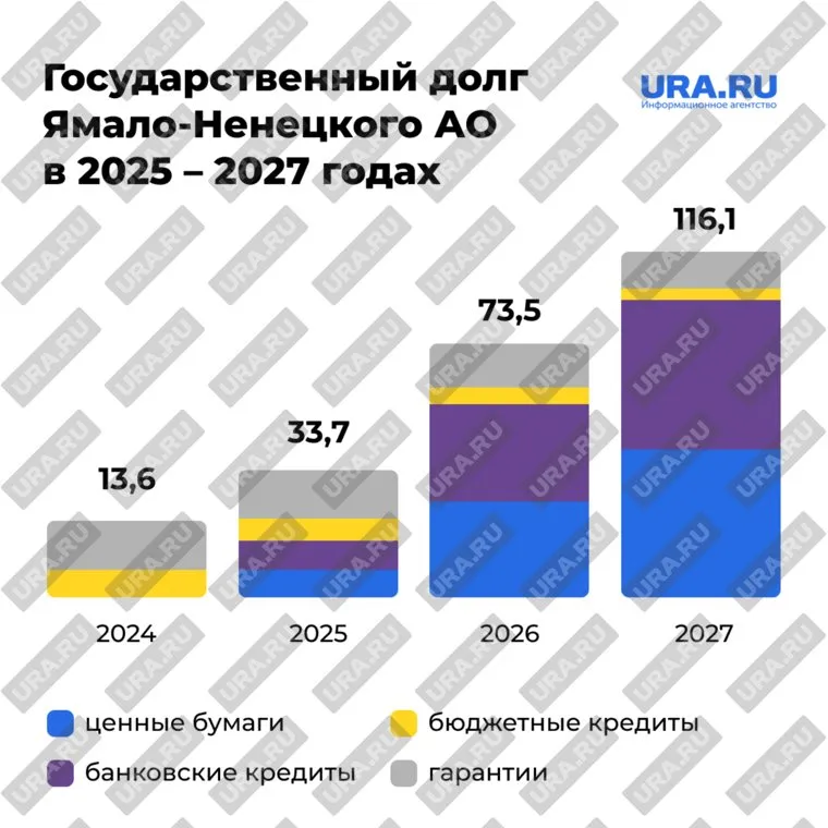 В ЯНАО в ближайшие три года будет расти сумма государственного долга. В структуре долговых обязательств округа помимо госгарантий и бюджетных кредитов немалое место займут банковские займы и ценные бумаги, следует из материалов окружного департамента финансов. В 2025 году объем госдолга составит 33,7 млрд рублей, в 2026-м — 73,5 млрд рублей. К 2027 году этот показатель вырастет до 116,1 млрд рублей, что почти в 16 раз больше, чем в январе 2024 года, когда объем долга составлял 10 млрд 271 млн рублей.