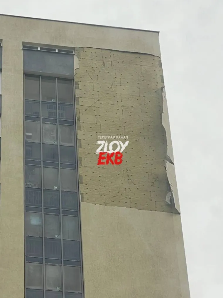 У высотки в Екатеринбурге снесло часть фасада. Видео