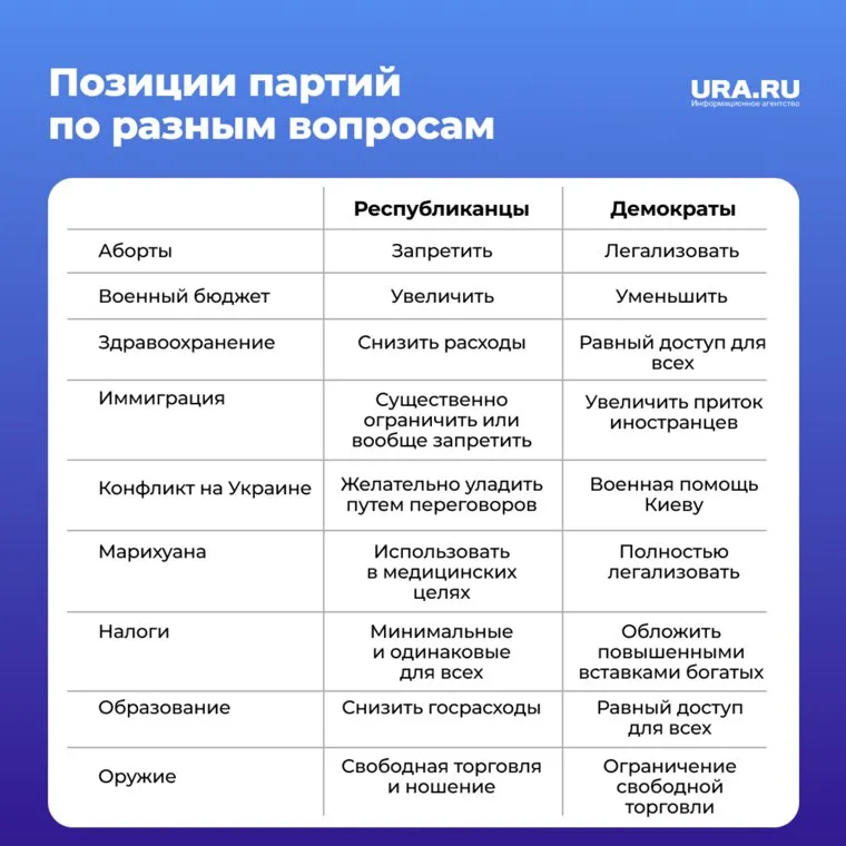 Республиканцы и демократы сменяют друг друга в США с 1854 года. Тогда была сформирована оппозиционная Демократической партии «молодая» Республиканская партия. 5 ноября 2024 года в США пройдут очередные выборы, и за пост президента вновь сразятся кандидаты от двух этих партий — Дональд Трамп от республиканцев и Камала Харрис от демократов. Чем отличаются их взгляды и почему они конфликтуют — в материале URA.RU.