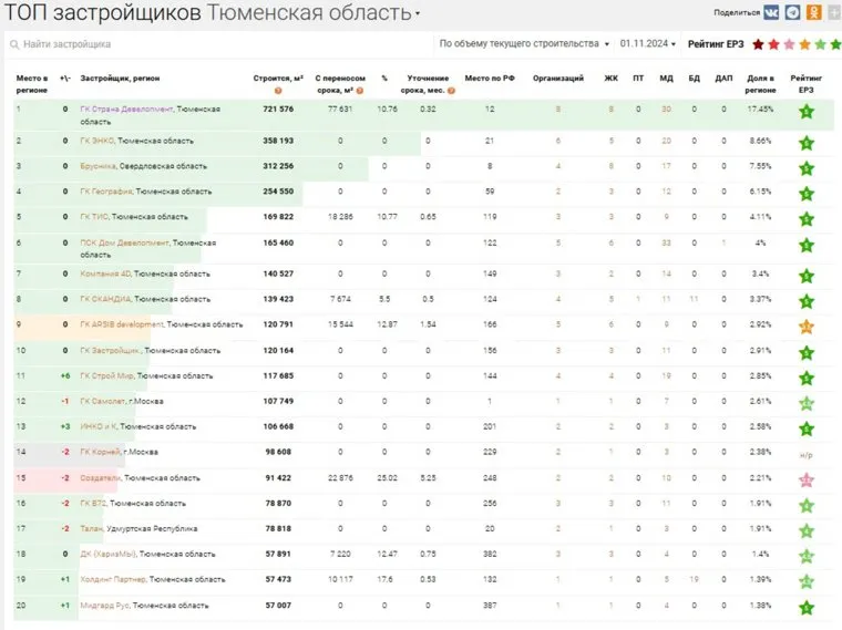 Важно: рейтинг составляется исключительно на основании объемов строительства в Тюменской области. Потребительские качества, класс жилья, стройки за пределами региона и иные показатели на положение компаний в рейтинге не влияют.