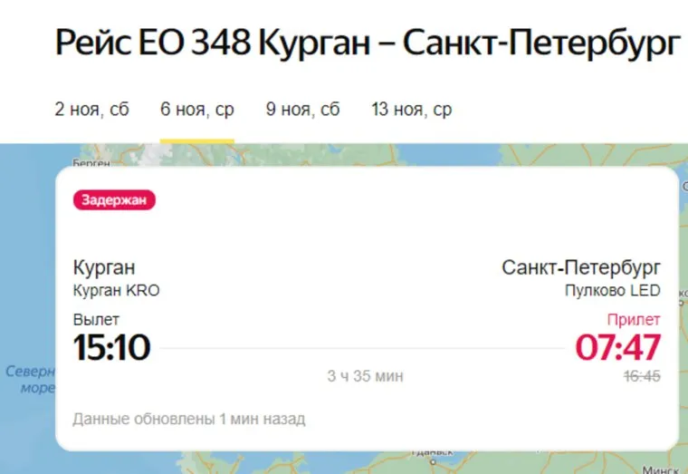 «Рейс EO 348 Курган — Санкт-Петербург авиакомпании Ikar. Задержан. Время прибытия: 07:47 7 ноября», — указано на онлайн-табло. По расписанию он должен был прилететь 6 ноября в 16:35 по местному времени.