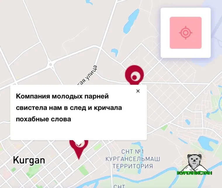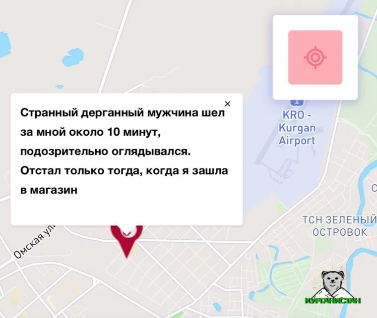Также «Курганистан» пишет, что в сентябре появилась карта с опасными местами для женщин. Тогда на ней было указано две точки: на перекрестке улиц Тимофея Невежина и Свердлова, где отмечают большой участок без освещения, а во дворах местные замечали выпивающие компании людей. На улице Бажова, в районе проспекта Конституции, местные заметили мужчину, который ублажал себя.
