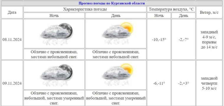 «Прогноз погоды в Курганской области на 8 ноября. Температура ночью минус 15 градусов. Местами небольшой снег. Ветер западный до 14 метров в секунду», — говорится на сайте Курганского ЦГМС. Три дня назад синоптики прогнозировали ночью 8 ноября 13-градусные морозы.