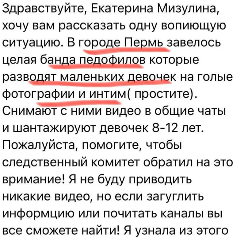 Пермяки обратились к главе Лиги безопасного интернета Екатерине Мизулиной с просьбой разобраться с бандой педофилов, орудующей в городе. Житель Перми прислал сообщение о мужчинах, которые пишут несовершеннолетним, просят их прислать интимные фото и шантажируют. Отправитель попросил привлечь Следственный комитет. Пост об этом появился в официальном telegram-канале Мизулиной.
