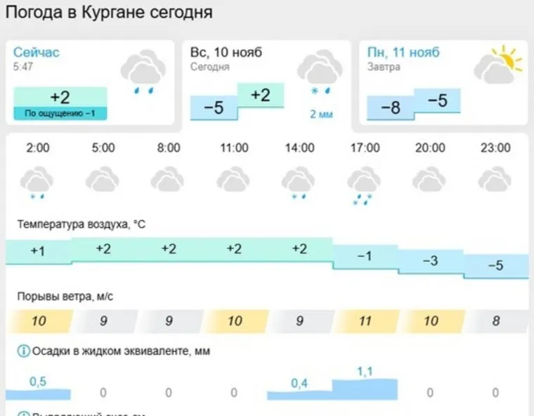 «В утренние часы в Кургане температура воздуха составит около +2 градусов. Днем вероятны перепады от -5 до +2. К вечеру похолодает до -8. Во второй половине дня возможны осадки в виде дождя и снега», — сообщает Gismeteo. Кроме этого, ожидается сильный ветер. Порывы могут достигать 10 м/с и более.