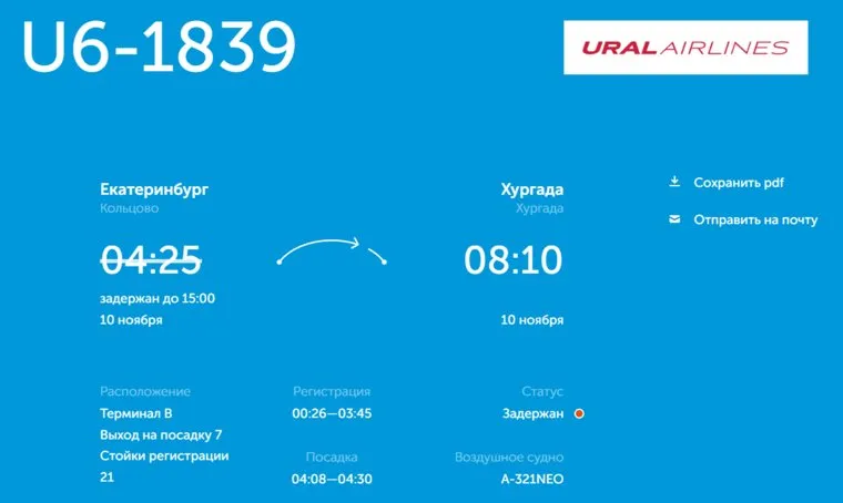 Рейс «Уральских авиалиний» в Египет задержали на 10 часов из-за поломки. Скрин