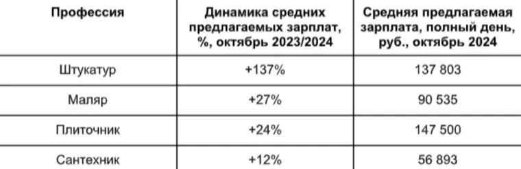 В топ-3 самых высокооплачиваемых профессий в сфере ЖКХ также вошли штукатуры, чьи зарплатные предложения выросли на 137% до 137 тысяч 803 рублей в месяц. На третьем месте по заработку среди специалистов в сфере ЖКХ оказались маляры. Их заработок увеличился на 27%. Кандидатам на данную должность в октябре 2024 года предлагали зарплату в размере 90 тысяч 535 рублей за месяц при полном рабочем дне.