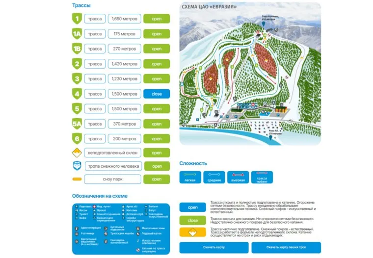 В ГЛЦ «Евразия» для любителей снежного спорта создано девять трасс с естественным и искусственным снегом. В пользовании посетителей трассы от 175 до 1500 метров. Также открыты: неподготовленный склон, тропа снежного человека и сноу-парк. На территории расположилась и трассы для ходьбы: в 500 метров, пять километров от вершины горы Копанец и еще одна пятикилометровая тропа за учебным склоном. Как указано на карте ГЛЦ, из развлекательных занятий предлагаются: тюбинг, крытый батут и искусственный скалодром.