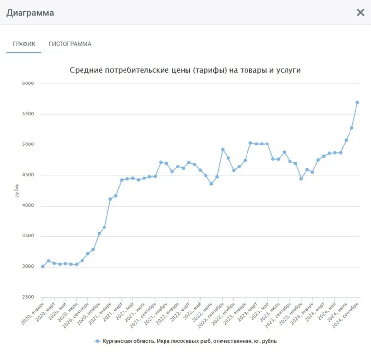 Для сравнения, в январе 2020 года цена составляла всего 3007 рублей. «Анализ цен показывает, что в течение наблюдаемого периода есть устойчивая тенденция к росту. Цены колебались, достигая пиковых значений в определенные месяцы, с наиболее заметным скачком в начале 2024 года, когда стоимость превысила 5000 рублей», — говорится в цифровых данных. Рост цен на икру лососевых рыб может быть сопоставим с общими тенденциями на продовольственном рынке региона, что указывает на инфляционные процессы и изменения в потребительских предпочтениях.