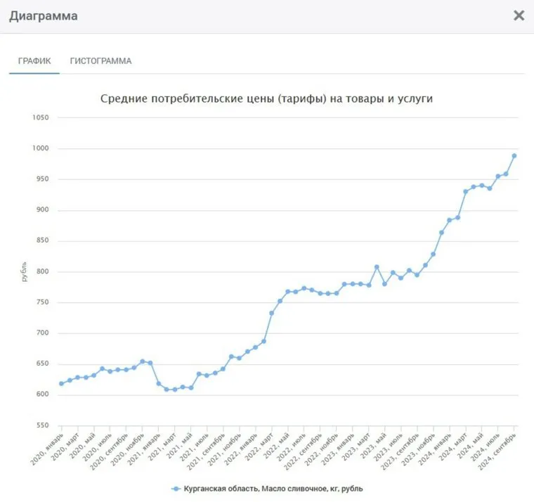 По данным портала Росстата, средняя цена на масло за год с сентября 2023 года изменилась с 800,71 рублей до 986,16 рублей. Кроме того, в Курганской области цены на сливочное масло увеличились почти вдвое за последние пять лет. В начале 2020 года стоимость килограмма масла составляла около 618 рублей, а к концу 2024 года она достигла 988,51 рублей.