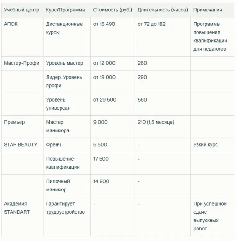 Образовательный центр «Премьер»» предлагает дистанционный курс «Мастер маникюра» за 9 000 рублей, продолжительность которого составляет 210 часов (1,5 месяца). Школа STAR BEAUTY предлагает более узкие курсы: «Френч» — за 5 500 рублей, повышение квалификации — за 17 500 рублей и «Пилочный маникюр» — за 14 900 рублей.