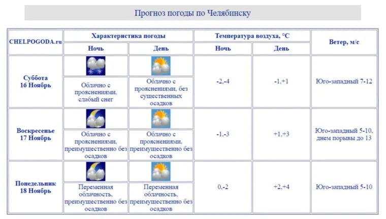 «В Челябинске в предстоящие выходные 16-17 ноября по ночам возможен слабый снег, днем — преимущественно без осадков. Дневные температуры поднимутся до трех градусов со знаком плюс», — говорится в прогнозе на сайте Гидрометеоцентра Челябинской области.