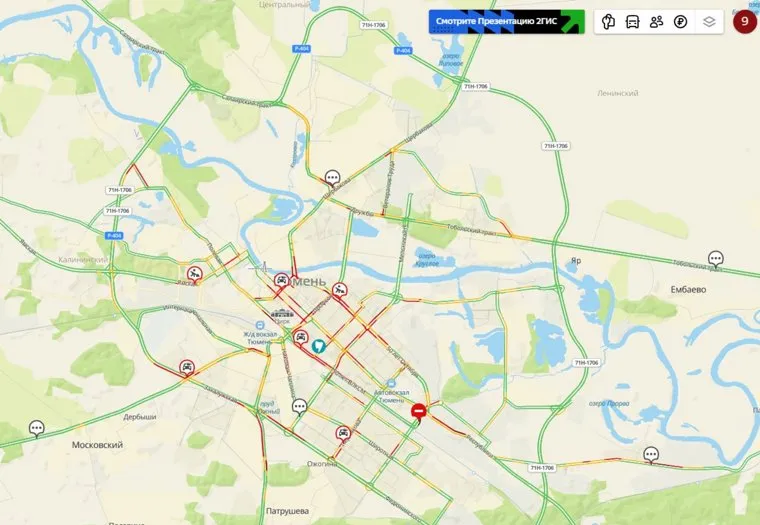 Движение на тюменских дорогах сильно затруднено девятибалльными пробками. Об этом сообщает картографический сервис 2gis.