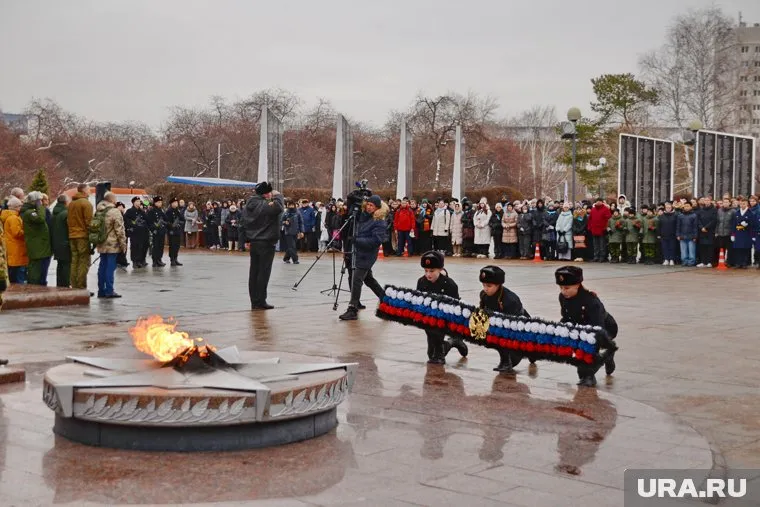 Мероприятие начинается с церемонии возложения венков и цветов к вечному огню.