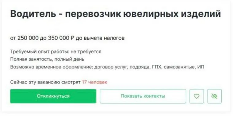 «Для работы предоставляется транспорт, график обсуждается 5/2, 2/2 или 3/3. Выплачиваются премии за сверхурочные, оформление по трудовому договору», — указал работодатель в объявлении. Работник может получать от 250 до 350 тысяч рублей.