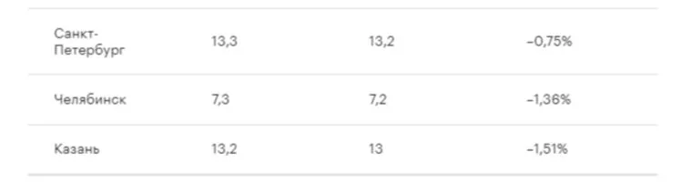 «Отрицательная динамика цен на квартиры в новостройках за год зафиксирована в трех городах-миллионниках. Стоимость квартир снизилась в Челябинске, Санкт-Петербурге и Казани. В Челябинске стоимость новых квартир упала на 1,36% до 7 миллионов 200 тысяч рублей за объект», — сообщается в исследовании на сайте РБК.