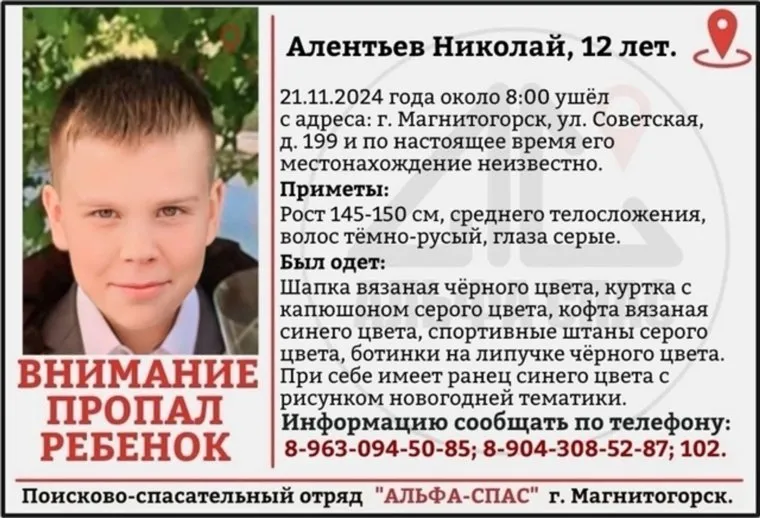 «Алентьев Николай, 12 лет. 21 ноября в 8:00 ушел с адреса: Магнитогорск, улица Советская, дом 199 и по настоящее время его местонахождение неизвестно», — сообщают волонтеры отряда.
