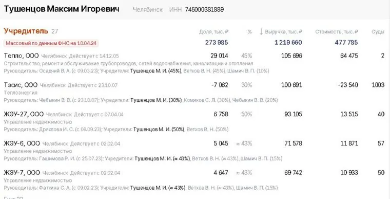 Основным активом Комякова и его пасынка Максима Тушенцова является теплоэнергетическое ООО «Тэсис», дела которой давно оставляют желать лучшего. В отличие от ООО «Центр» аналогичного профиля — с выручкой более 200 млн рублей и стоимостью бизнеса в 102,6 млн рублей. Также Тушенцов ведет совместный коммунальный бизнес с Владимиром Ветховым, отцом действующего депутата гордумы Кирилла Ветхова.