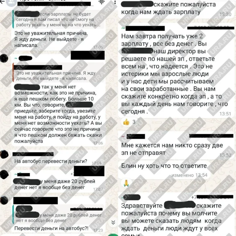 Также инсайдеры предоставили агентству переписку с одним из директоров. В ней один из работников жалуется, что у него якобы не хватает денег даже доехать до места работы. Судя по скриншоту из мессенджера, в ответ на это один из руководителей написал: «Перевести деньги на автобус?». Эту фразу начальнику пришлось повторить дважды, однако работник на предложение не соглашался. Еще на одном скриншоте рабочий несколько раз спрашивал о том, когда будут выплачены деньги и утверждал, что якобы уже должны две зарплаты. Ответных сообщений на эти жалобы не последовали.