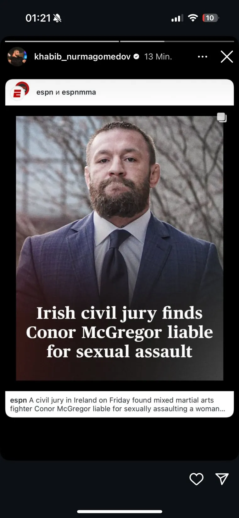 О признании ирландского бойца Конора Макгрегора виновным в изнасиловании девушки во время вечеринки в 2018 году узнал бывший чемпион UFC Хабиб Нурмагомедов. Новость об этом он опубликовал у себя в соцсетях.