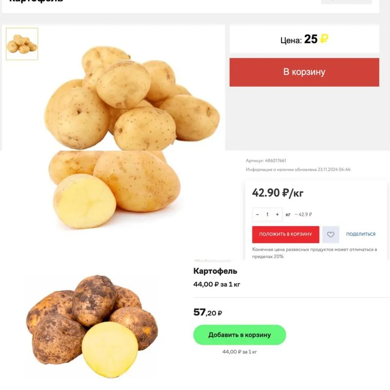 «Картофель желтый. 25 рублей за килограмм» — отмечается на сайте магазина «Светофор». Стоимость крупного картофеля в «Доброцене» указана в 42 рубля 90 копеек за килограмм. В «Чижике» предлагается приобрести картошку за 57 рублей 20 копеек.