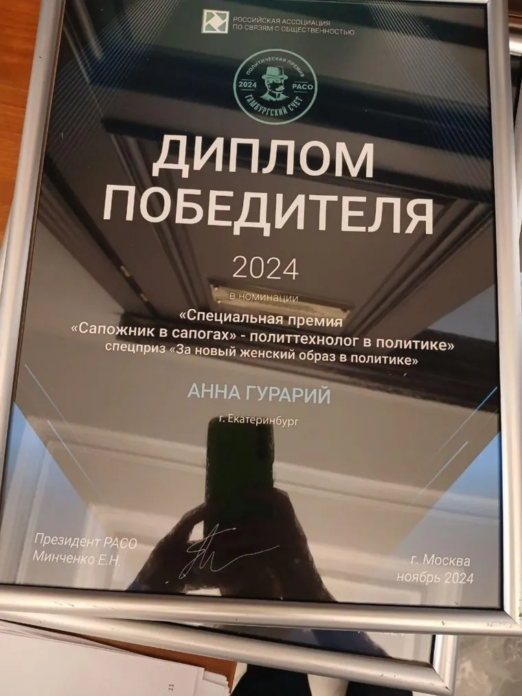 Гурарий была представлена в номинации «Сапожник в сапогах» — политтехнолог в политике. Ее конкурентом был медиаменеджер из Санкт-Петербурга Александр Малькевич, в сентябре избравшийся в местное заксобрание. Победил он.