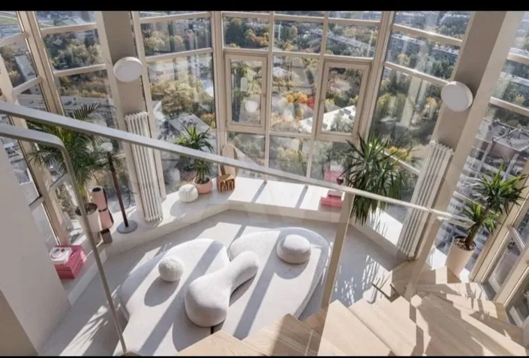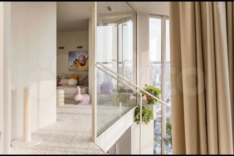 К особенностям пентхауса относятся высота потолков в шесть метров и наличие второго этажа, на котором расположена спальня. Отмечается, что квартира находится на 23 этаже, где открываются невероятные виды.