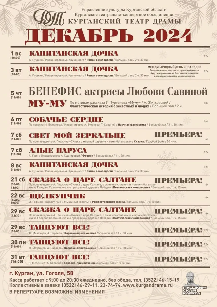 В преддверии новогодних праздников курганский драмтеатр готовит настоящий подарок для своих зрителей — три уникальные театральные премьеры. Любители театрального искусства смогут насладиться разнообразием жанров и сюжетов. Афишу предстоящих событий на декабрь опубликовал драмтеатр.