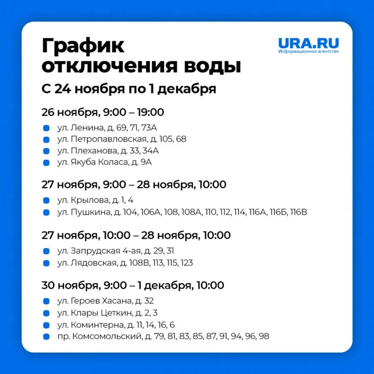 «Плановое время отключения. 26 ноября 09:00 — 19:00, аварийно-восстановительные работы по адресам: Домостроительная, 29, Петропавловская, 109. Адреса без воды (на пониженном давлении): Александра Щербакова, 30, 32; Героя Васькина, 10, 12, 3, 5; Домостроительная, 22, 33; Ленина, 69, 71, 73А; Петропавловская, 105, 68; Плеханова, 33, 34А; Якуба Коласа, 9А», — информирует «Новогор-Прикамье».