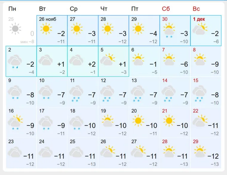 «В начале декабря температуры воздуха в дневное время могут достигать 1-2 градусов тепла, ночью около 3-5 градусов мороза. В середине месяца днем около 7-9 градусов мороза, ночью 9-12 градусов мороза и снегопады», — говорится в прогнозе погоды.