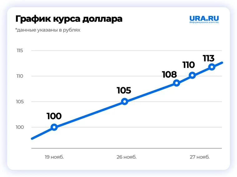 На международной валютной бирже Форекс стоимость доллара достигла отметки в 110 рублей к 27 ноября. Это первый случай, когда доллар превысил подобную отметку с 16 марта 2022 года. На Московской бирже стоимость долларового фьючерса с декабрьской поставкой выросла на 0,47%, составив 107,500 рублей. Это соответствует курсу 107,5 рубля за доллар. Центральный банк России установил официальный курс доллара на 27 ноября на уровне 105,0604 рубля, евро — на уровне 110,4943 рубля, юаня — на уровне 14,4449 рубля.