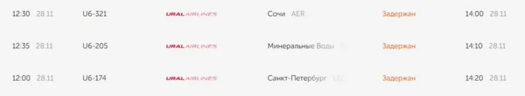 В екатеринбургском аэропорту Кольцово 28 ноября перенесли рейсы «Уральских авиалиний» в Сочи, Минеральные Воды и Санкт-Петербург. Информация об этом появилась на онлайн-табло авиагавани.