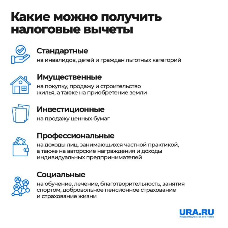 По данным ФНС, существует пять основных видов налоговых вычетов. Для получения каждого из них необходимо наличие официального дохода, с которого уплачивается налог на доходы физических лиц.