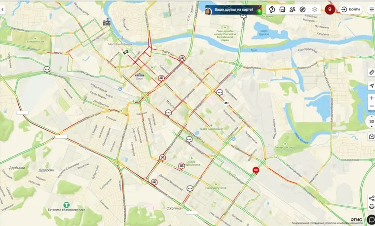 Пробки в Тюмени оцениваются на девять баллов из десяти. Такие данные опубликованы на сервисе 2 ГИС.