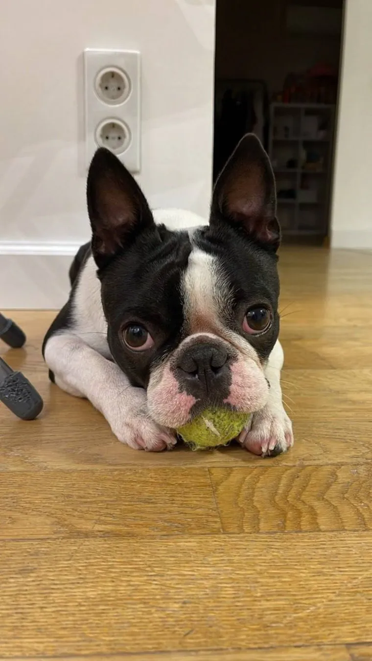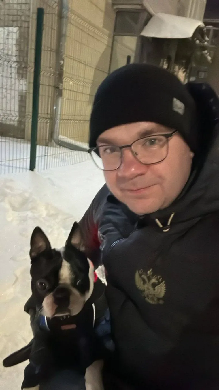 Эдуард Соснин является хозяином черно-белого бостон-терьера