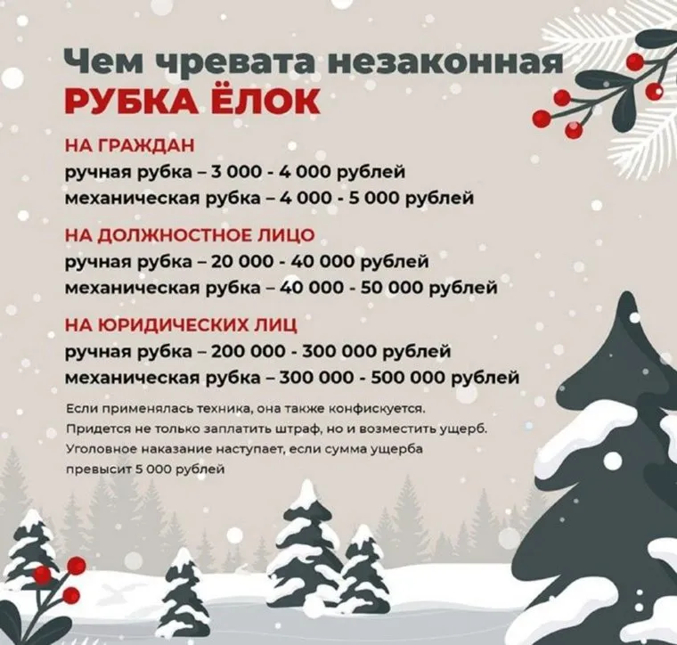 Один человек сможет получить разрешение максимум на пять деревьев. В администрации также напомнили, что за незаконную рубку предусмотрены штрафы, сумма которых разнится от 3 000 до 500 000 рублей.