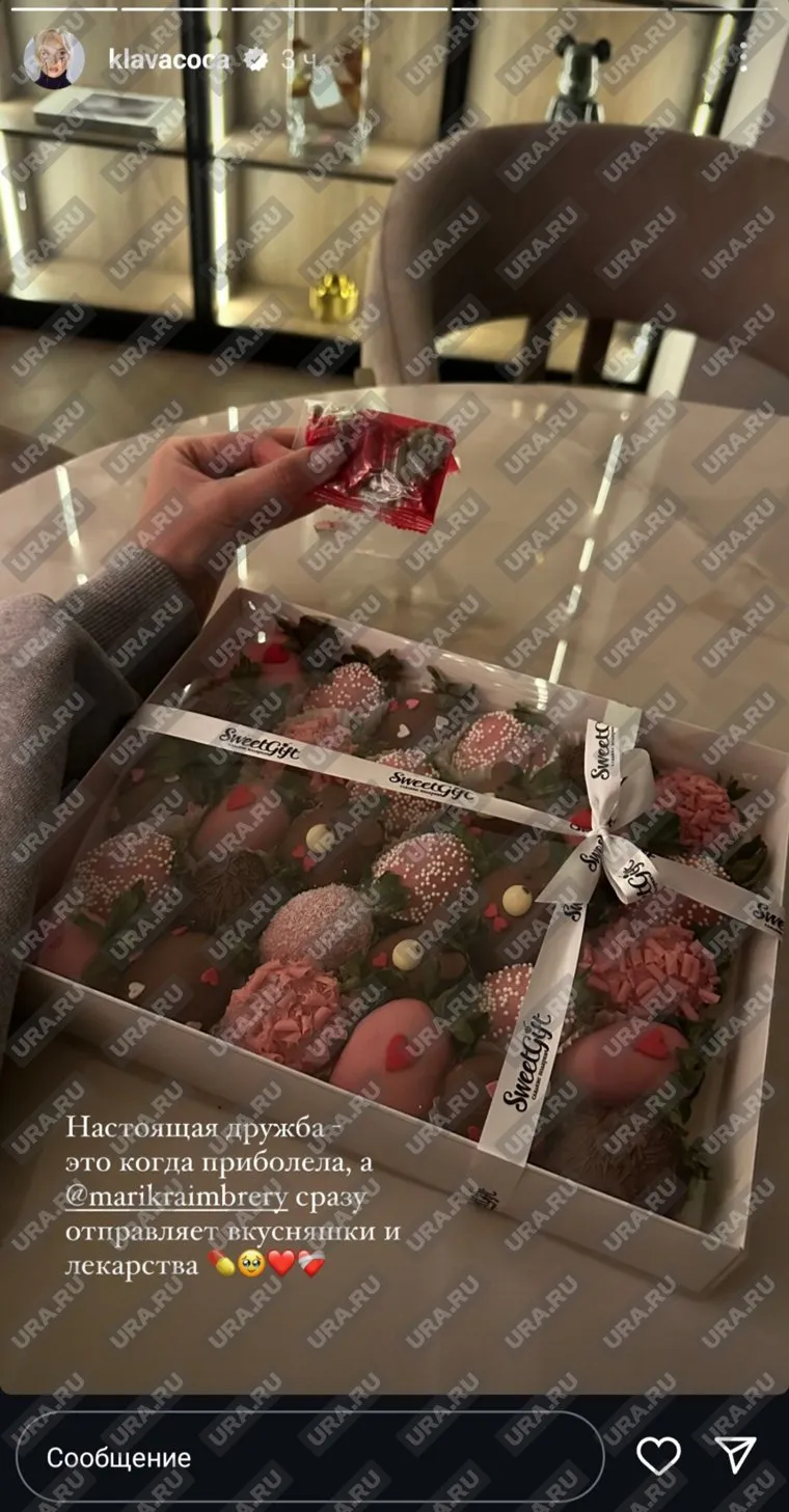 По ее словам, справиться с тем, что она приболела ей помогает певица Мари Краймбрери. От коллеги по цеху, с которой спела в соавторстве в новом альбоме, она получила лекарства и «вкусняшки».