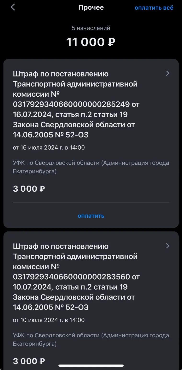 «Приезжая на работу, я встаю на платную парковку на Малышева, всегда ее оплачиваю. Но летом, с июня по июль, мне стали приходить штрафы от администрации города. Как я понимаю, они за неоплату парковки, на дни, когда меня либо не было в городе, либо я оплачивала парковку, либо это были выходные дни, когда моя машина физически не могла стоять там. Я обратилась к юристу, он подал жалобу в администрацию, от мэрии пришел ответ, что на мне таких штрафов не числится, но при этом они продолжают висеть в Госуслугах», — рассказала девушка.