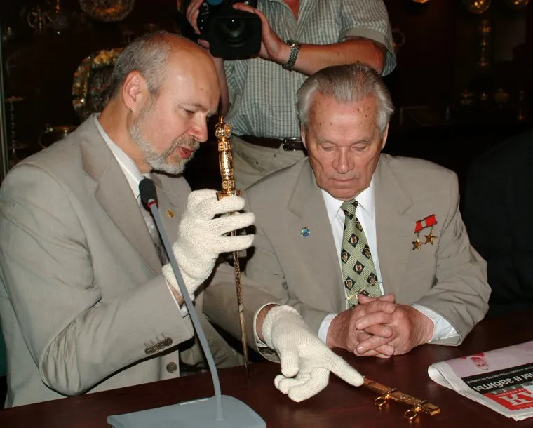 «Когда в 2017 году отмечали 70-летие с момента создания автомата, художник Юрий Рябков украсил изделие традиционным рисунком. Гравер и инженер были знакомы. Скромный орнамент покрыл ствольную коробку, газовую трубку, предохранитель, магазин и затылок автомата. На крышке ствольной коробки есть автограф Калашникова, а на стволовой коробке — портрет легендарного конструктора», — пояснил Томея.