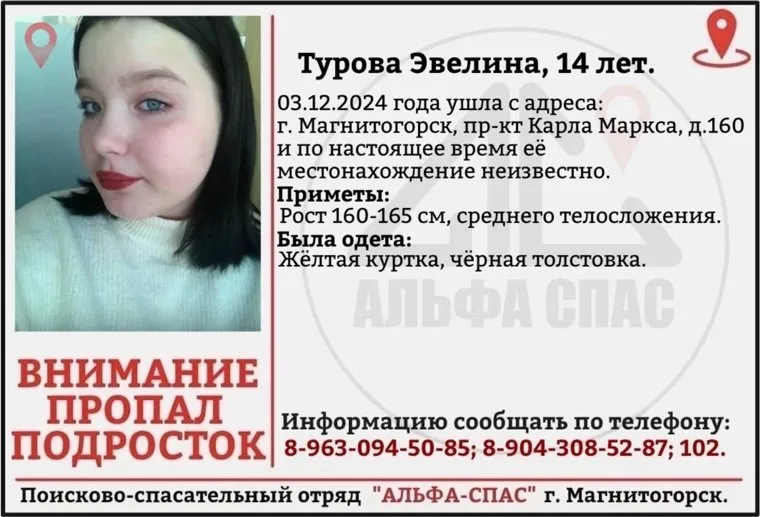 «Турова Эвелина, 14 лет. 3 декабря ушла с адреса проспект Карла Маркса, дом 160 и по настоящее время ее местонахождение неизвестно», — сообщает поисково-Спасательный отряд «Альфа-Спас» на своей официальной странице в соцсети «ВКонтакте».