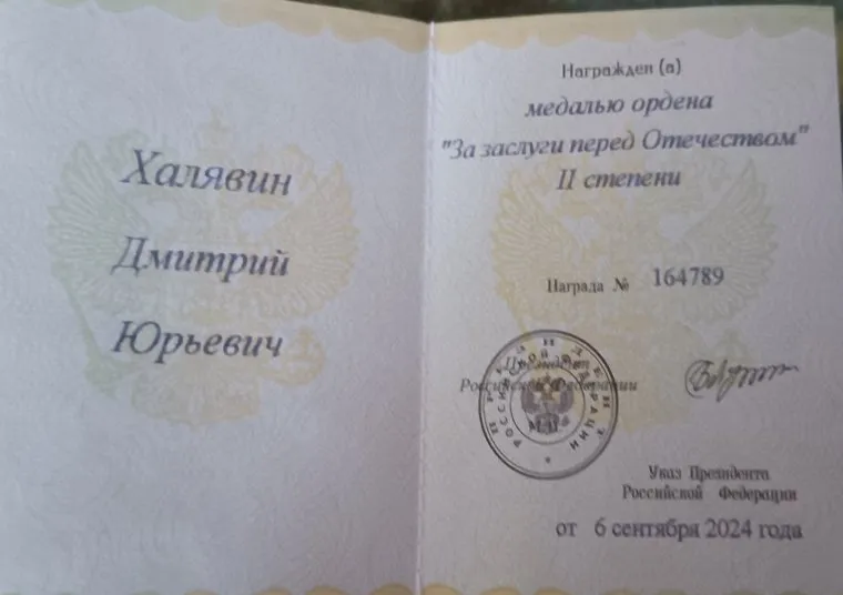 Указ о награждении Халявина подписал 6 сентября президент Владимир Путин. Медаль Халявин получил, вероятно, позже. Пост с фотографиями на его страничке в соцсети появился 13 октября.