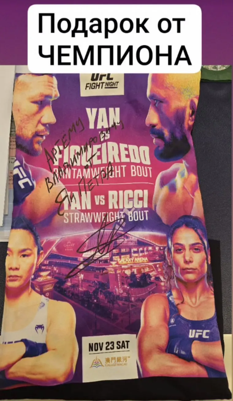 «Подарок от чемпиона», — подписал Жога. «Артему Владимировичу от Петра Ян», — написал в свою очередь на сувенире спортсмен.