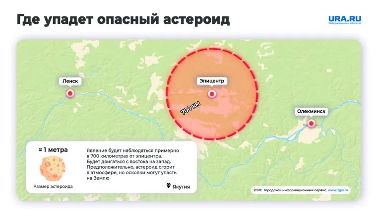 Астероид, направляющийся к Земле, пересечет атмосферу планеты в 19:17 по московскому времени над территорией Якутии. Наблюдать это явление можно будет в городе Олекминск, который оказывается непосредственно под траекторией полета космического объекта. Однако бояться его не стоит, поскольку диаметр астероида составляет всего один метр, что делает его абсолютно безопасным для Земли.