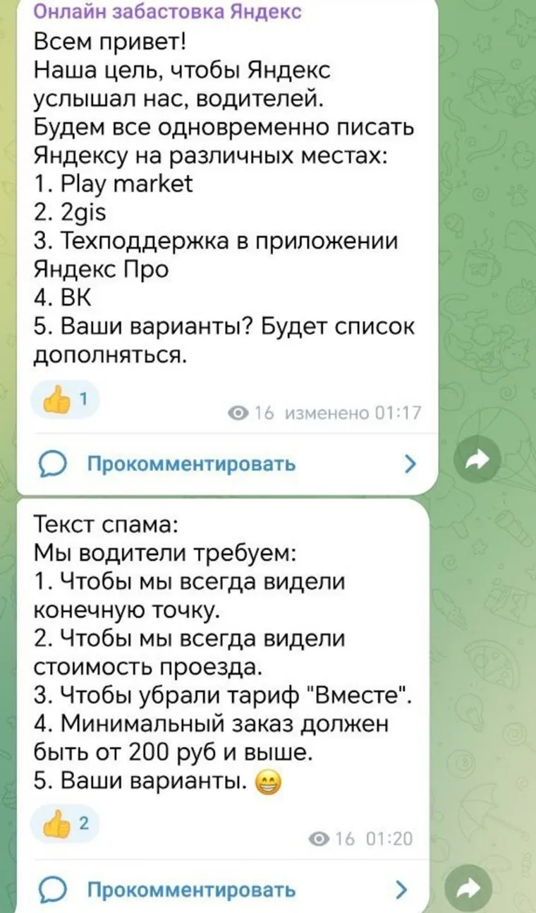 Водители планируют подготовить список требований к агрегатору, которые затем будут распространяться как спам на различных онлайн-площадках. «Наша цель, чтобы „Яндекс“ услышал нас, водителей. Будем все одновременно писать „Яндексу“ на различных местах: Play market, 2gis, техподдержка в приложении „Яндекс Про“, ВК... Мы, водители, требуем: чтобы мы всегда видели конечную точку маршрута, чтобы мы всегда видели стоимость проезда, чтобы убрали тариф „Вместе“. Минимальный заказ должен быть от 200 рублей и выше», — указано в обсуждениях закрытого чата таксистов в Telegram.