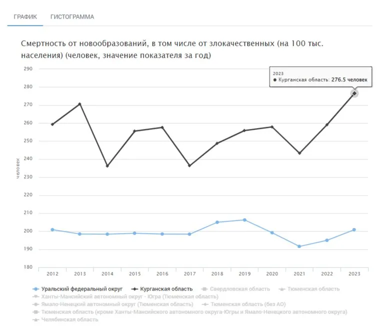 «В Курганской области в 2023 году смертность от новообразований составила 276,5 человек на 100 тысяч населения. Это самый высокий показатель в России. Второе место занимает Псковская область. В среднем в России смертность от рака 197,4 человек на 100 тысяч. В Уральском федеральном округе этот показатель 200,9 человек на 100 тысяч населения», — говорится на сайте государственной статистики ЕМИСС.