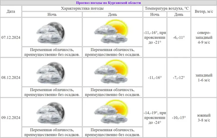 «Прогноз погоды по Курганской области. В субботу, 7 декабря прогнозируется переменная облачность, преимущественно без осадков. Температура воздуха ночью -11,-16 градусов, при прояснении до -21 градус. В понедельник, 9 декабря температура воздуха ночью -14,-19 градусов, при прояснении до -24 градуса», — указано в прогнозе ЦГМС на ближайшие три дня.