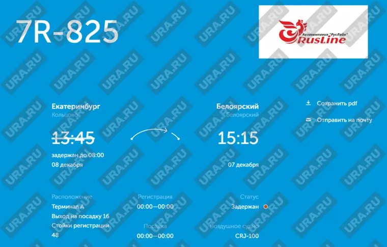 «Рейс 7R-825 судна CRJ-100 должен был вылететь из Екатеринбурга 7 декабря в 13:45 и долететь до Белоярского в 15:15 по местному времени. Однако рейс задержан», — говорится на сайте Кольцово. Сейчас вылет борта стоит на 8 декабря в 08:00 по времени Екатеринбурга.
