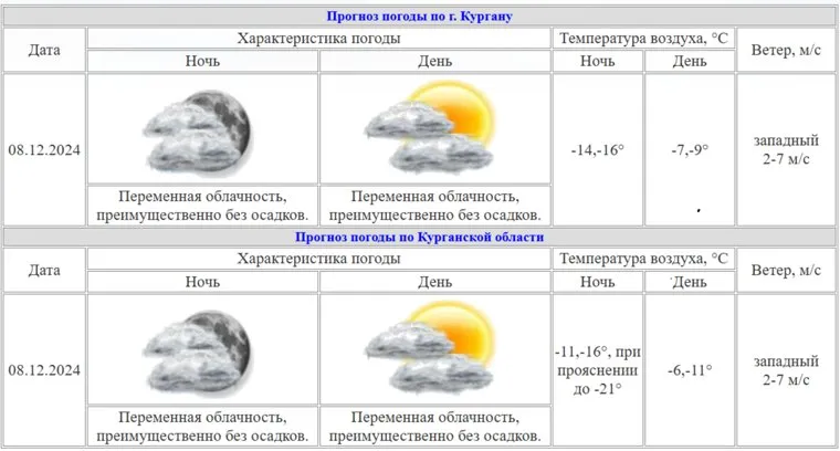 «Температура воздуха в ночные часы — около -11, -16, при прояснении до — 21 градуса. Днем столбик термометра поднимется до -6, -11», — указано на сайте Курганского ЦГМС.